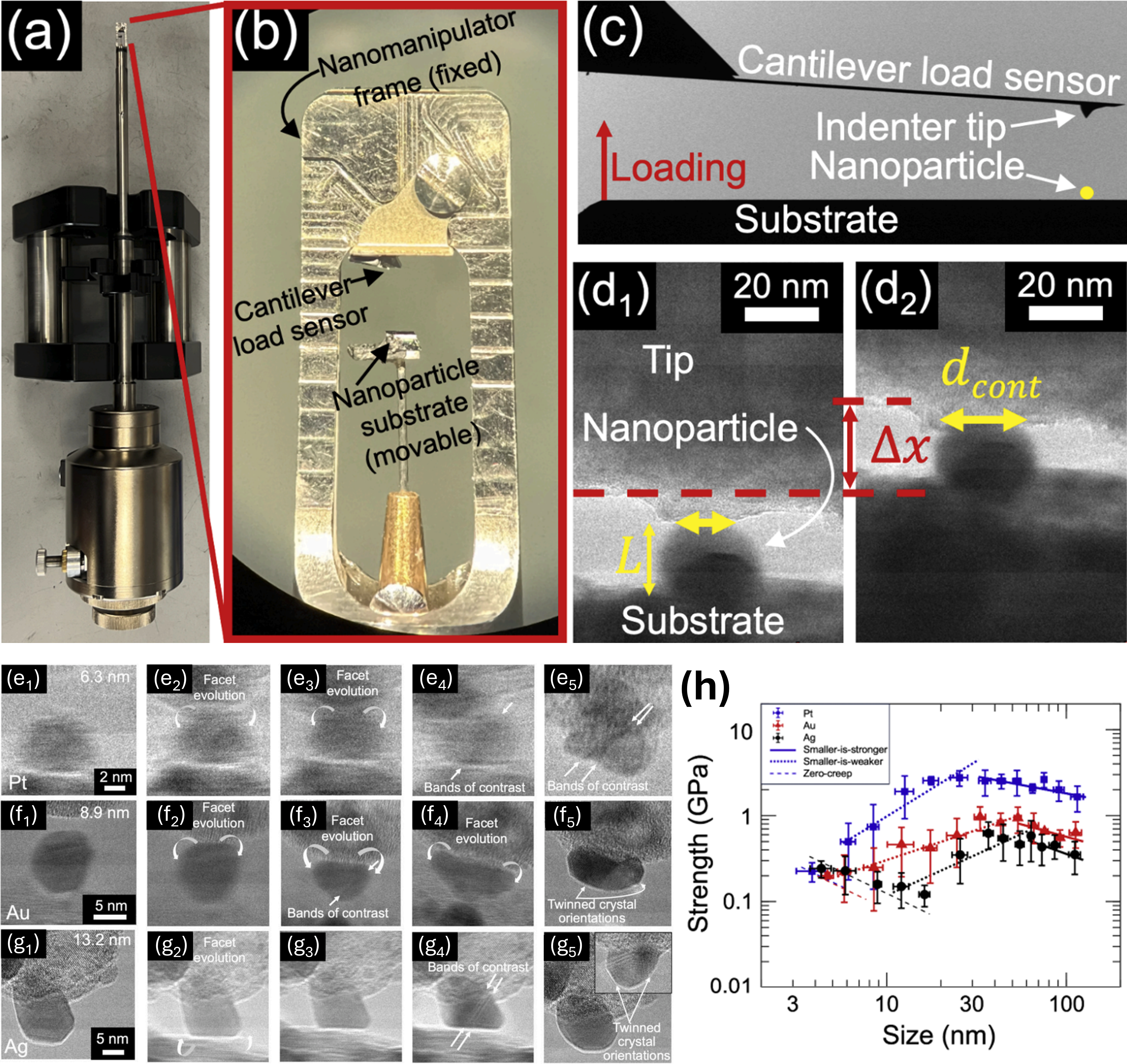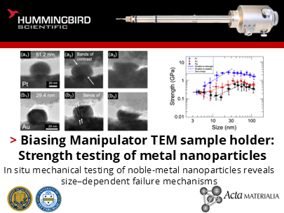Ruikang Ding and Tevis D.B. Jacobs of the University of Pittsburgh, along with Ashlie Martini of the University of California, Merced, have used the Hummingbird Scientific Biasing Manipulator TEM sample holder to directly observe failure mechanisms of Au, Ag, and Pt nanoparticles under compression, enabling the measurement of nanoparticle strength as a function of their size.