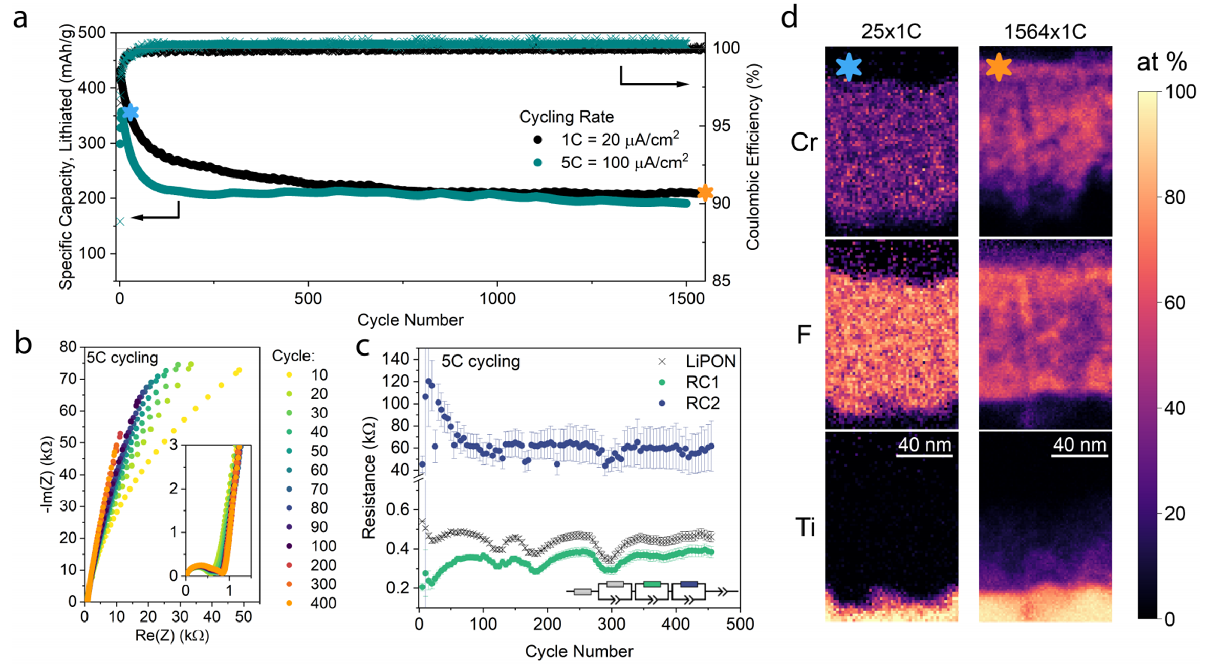 Long term behavior (a) Specific discharge capacity vs cycle number for a Cr-LiF cathode cycled at 1C (black) and 5C (teal). Coulombic efficiency is shown for all cycles on the right axis. (b) Nyquist representation of PEIS spectra taken after different cycle numbers. (c) Resistance vs cycle number for fitted resistance values of the LiPON, RC1,and RC2 contributions. The equivalent circuit used to fit the PEIS spectra is shown. (d) STEM-EDX maps of Cr, F, and Ti for samples after 25 cycles and 1564 cycles at 1C (shown as stars on panel (a)).