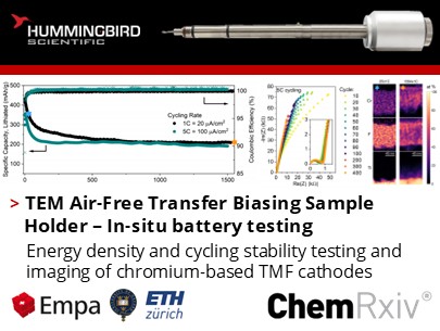 Joel Casella, Marta D. Rossell, Yaroslav E. Romanyuk and their colleagues from Empa – Swiss Federal Laboratories for Materials Science and Technology, University of Oxford, and ETH Zurich transferred air-sensitive, lithiated Cr-LiF thin film cathodes to the TEM for testing cycling stability using the Hummingbird MEMS Air-free Transfer Biasing sample holder. The team used coevaporation of metallic Cr and LiF to fabricate heterogenous two-phase thin films with a tunable stoichiometric ratio.