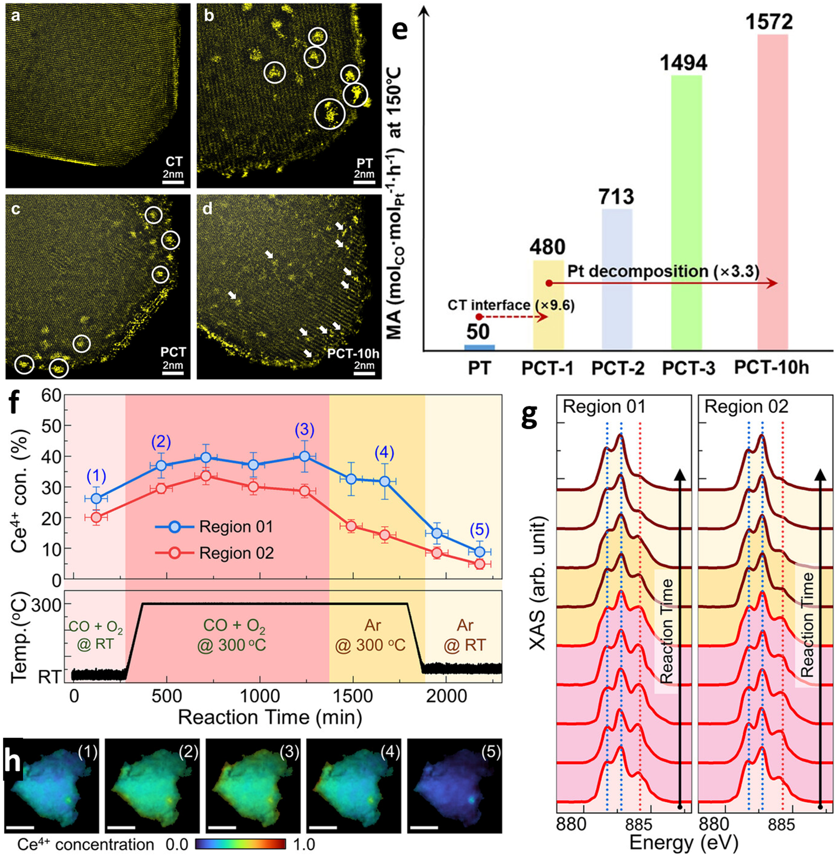 HAADF-STEM images of the hybrid supporting oxide a) and the resultant Pt-containing catalysts b–d). a) CT hybrid supporting oxide, b) PT, c) PCT, and d) PCT after 10 h of CO oxidation reaction. White circles in (b,c) present Pt NPs. White arrows in (d) highlight Pt-SAs and clusters. e) Enhanced specific mass activity of PCT during repeated and prolonged CO oxidation reaction. The PCT-n presents the number of repeating historical cycles of CO oxidation to which the PCT catalyst is exposed. The MA of Pt was increased by 3.3 times from PCT-1 to PCT-10 h. The MA of PT catalyst without Ce addition was increased by 9.6 times upon adding 2 wt.% of Ce (from PT to PCT-1). f) In-situ tracking of Ce4+ concentration and temperature for the in situ XAS and STXM CO oxidation (1 vol.% CO + 4 vol.% O2 + 95 vol.% Ar) experiment. g) Averaged XAS spectra for two the experimental regions and h) STXM Ce oxidation state maps under the conditions marked (1)-(5) in (f). Copyright © 2025 The Author(s). Small published by Wiley-VCH GmbH