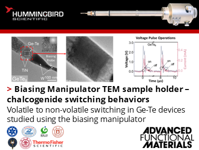 Zihao Zhao, Mengfei Zhang, Zhitang Song and their colleagues from the Chinese Academy of Sciences, Min Zhu of Shanghai Jiao Tong University and their colleagues from Huazhong University of Science and Technology, Gunma University, Thermo Fisher Scientific China, Ningbo University, and University of Cambridge used the Hummingbird Scientific Biasing Manipulator TEM sample holder for direct in situ observation of the nanoscale structural rearrangements, phase transitions, and electrically driven switching pathways that govern volatile-to-non-volatile behavior in Ge–Te devices.
