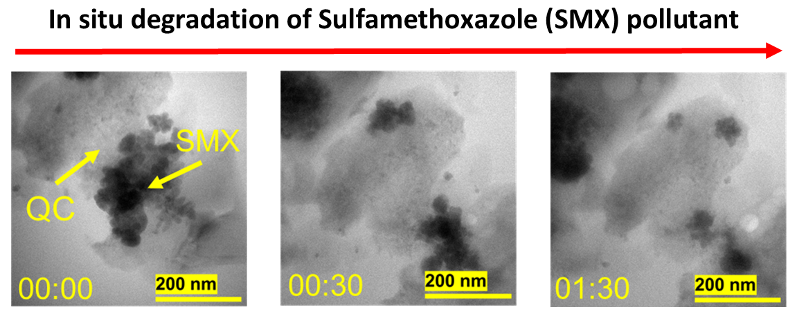 In situ liquid flow TEM images showing how sulfamethoxazole (SMX) molecules interact with and break down on the surface of 2D AlFeCoNiCu quasicrystals (QCs). At the start of the experiment (00:00), SMX appears as dark regions adsorbed onto the lighter QC surface. As time progresses (00:30 and 01:30), these dark areas gradually disappear, revealing the step-by-step degradation of SMX.