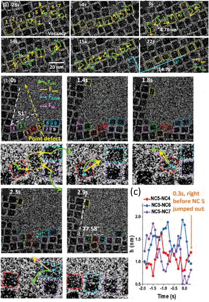 a) TEM footage frames showing self-elimination of a vacancy during self assembly of palladium nanocubes. The length of the arrows indicates the logarithm scale of the net magnitudes of Fnet and τ. b) TEM frames showing self-elimination of a point defect during self assembly of palladium nanocubes. Corresponding lower frames show translational and rotational movements represented by arrows. The arrow lengths represent the logarithmic scale of the calculated magnitudes for Fnet, FvdW, FSh, and τNet. c) Measured separations between NC pairs (5–4, 5–6, and 5–7) prior to the ejection of NC 5. Dashed arrows indicate the nanocube movement directions, with sizes scaled according to logarithmic magnitude. Copyright © 2024 The Authors. Published by American Chemical Society