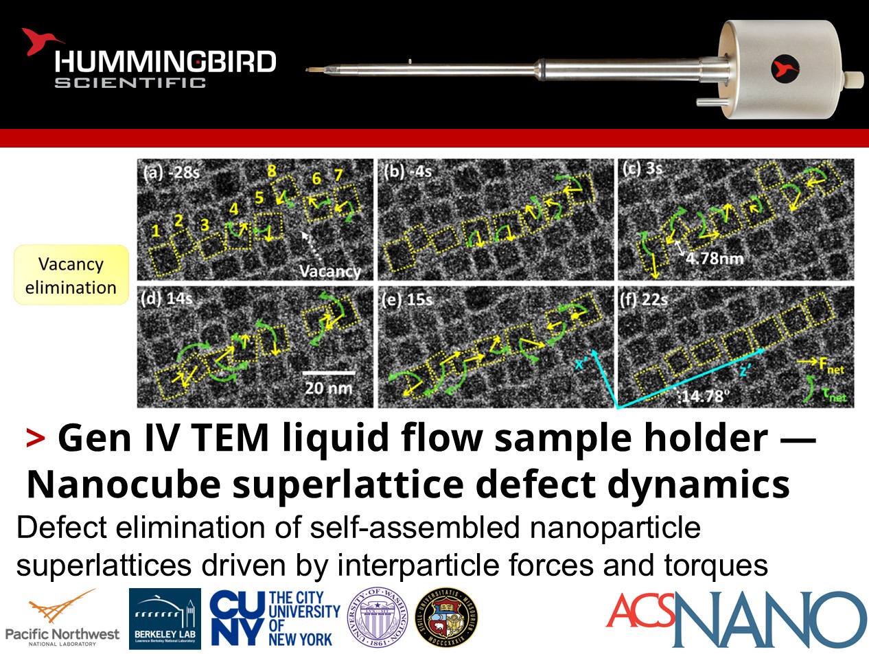 Jaewon Lee, Dongsheng Li, James De Yoreo and their colleagues at the Pacific Northwest National Laboratory, Berkeley Lab, the University of Washington – Seattle, and CUNY City College of New York have used the Hummingbird Scientific Gen IV liquid flow TEM holder to observe self-healing dynamics of palladium nanocube superlattice defects during self-assembly.