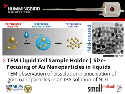 Wenhui Wang, Utkur Mirsaidov and their colleagues from the National University of Singapore and Southeast University used Hummingbird Scientific’s liquid-cell TEM sample holder to visualize, in real time, the transformation of polydisperse Au nanoparticles into monodisperse sub-10 nm particles in the presence of thiol ligands. Their work provides direct mechanistic evidence that size-focusing occurs via complete dissolution of initial particles followed by renucleation and growth, rather than by etching or splitting.