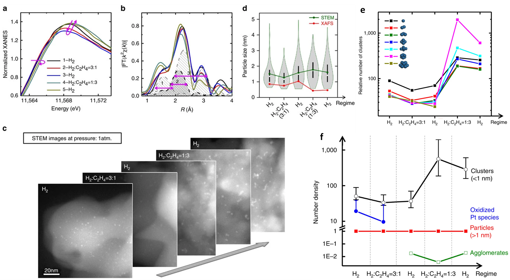 a) XANES spectra, b) Fourier transform magnitudes of Pt L3edge EXAFS spectra, and c) STEM images as measured in operando mode. d) Combined EXAFS and STEM results. e) Relative numbers of clusters (normalized by # of particles counted in the STEM size distribution above the 1 nm cutoff) obtained by combining the results of XAFS and STEM. f) Combination of XAFS and STEM analyses accounts for the Pt species and for their evolution in reaction conditions. Copyright © 2015 Springer Nature Limited