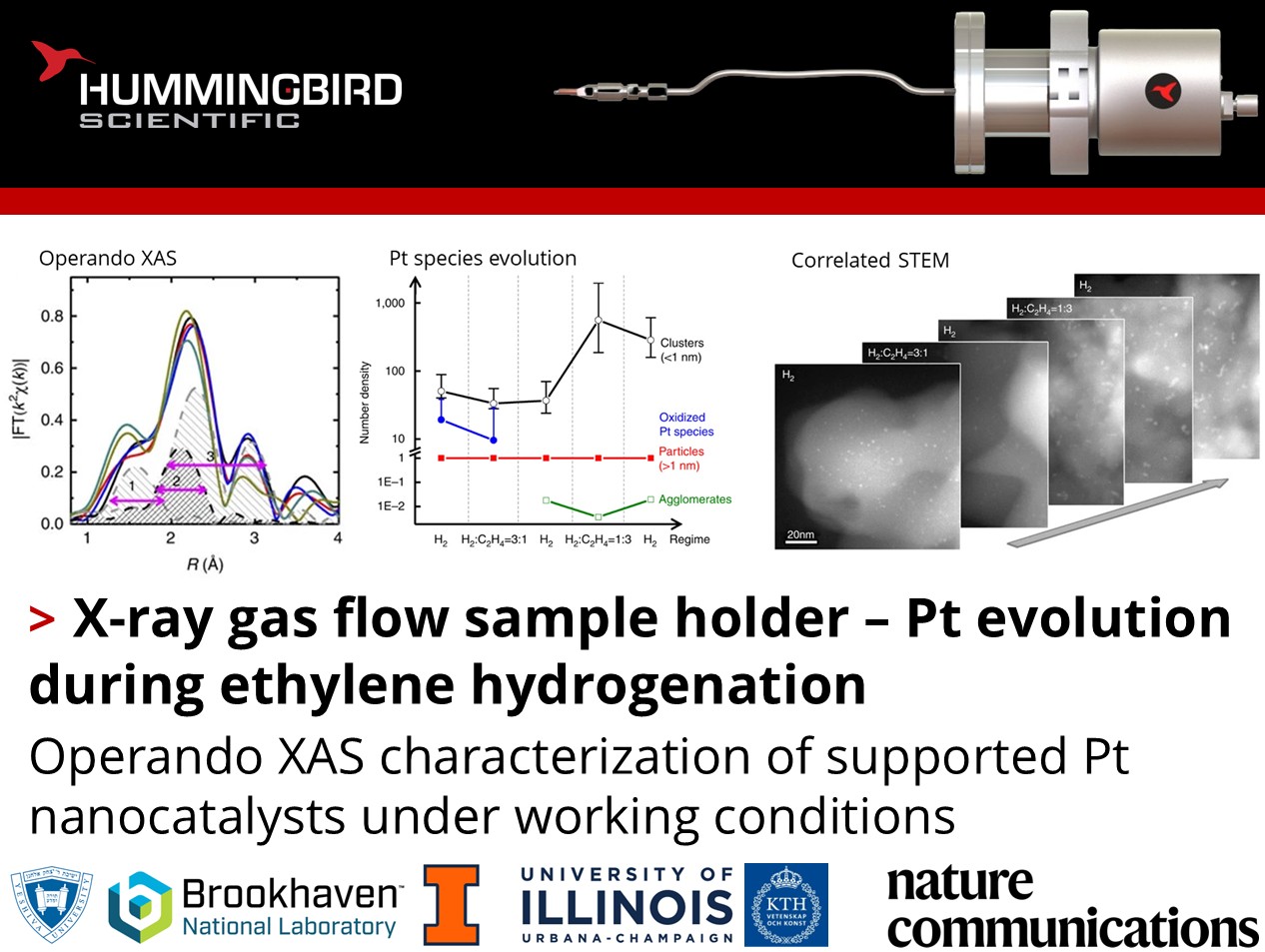 Hummingbird Rewind: As part of our three-part series featuring the new X-ray gas heating sample holder, we recall an early demonstration of the method from Yuanyuan Li and Anatoly Frenkel from Yeshiva University, along with their colleagues from Brookhaven National Laboratory, the University of Illinois at Urbana Champaign, and KTH Royal Institute of Technology. The gas flow X-ray sample holder was used to characterize the structural evolution of supported Pt nanocatalysts during ethylene hydrogenation. The team combined correlated synchrotron X-ray absorption spectroscopy (XAS) including X-ray absorption near edge structure (XANES) and extended X-ray absorption fine structure (EXAFS) with scanning transmission electron microscopy (STEM) to demonstrate dynamic transformations across a broad range of cluster sizes.